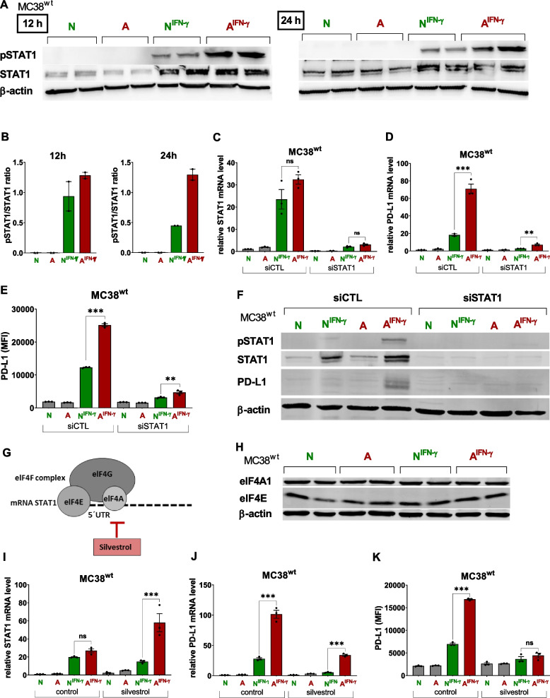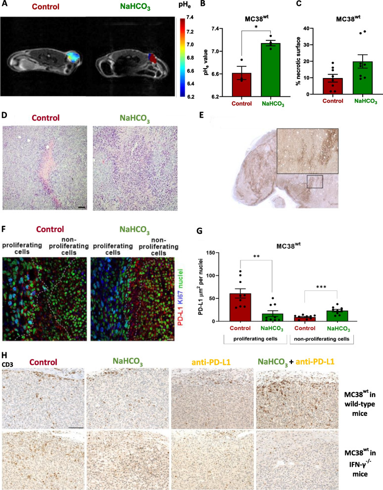 Immune checkpoint inhibitors have revolutionized cancer therapy, yet the efficacy of these treatments is often limited by the heterogeneous and hypoxic tumor microenvironment (TME) of solid tumors. In the TME, programmed death-ligand 1 (PD-L1) expression on cancer cells is mainly regulated by Interferon-gamma (IFN-γ), which induces T cell exhaustion and enables tumor immune evasion. In this study, we demonstrate that acidosis, a common characteristic of solid tumors, significantly increases IFN-γ-induced PD-L1 expression on aggressive cancer cells, thus promoting immune escape. Using preclinical models, we found that acidosis enhances the genomic expression and phosphorylation of signal transducer and activator of transcription 1 (STAT1), and the translation of STAT1 mRNA by eukaryotic initiation factor 4F (elF4F), resulting in an increased PD-L1 expression. We observed this effect in murine and human anti-PD-L1-responsive tumor cell lines, but not in anti-PD-L1-nonresponsive tumor cell lines. In vivo studies fully validated our in vitro findings and revealed that neutralizing the acidic extracellular tumor pH by sodium bicarbonate treatment suppresses IFN-γ-induced PD-L1 expression and promotes immune cell infiltration in responsive tumors and thus reduces tumor growth. However, this effect was not observed in anti-PD-L1-nonresponsive tumors. In vivo experiments in tumor-bearing IFN-γ-/- mice validated the dependency on immune cell-derived IFN-γ for acidosis-mediated cancer cell PD-L1 induction and tumor immune escape. Thus, acidosis and IFN-γ-induced elevation of PD-L1 expression on cancer cells represent a previously unknown immune escape mechanism that may serve as a novel biomarker for anti-PD-L1/PD-1 treatment response. These findings have important implications for the development of new strategies to enhance the efficacy of immunotherapy in cancer patients.