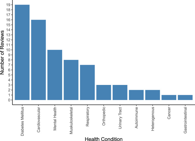 Health interventions based on mobile phone or tablet applications (apps) are promising tools to help patients manage their conditions more effectively. Evidence from randomized controlled trials (RCTs) on efficacy and effectiveness of such interventions is increasingly available. This umbrella review aimed at mapping and narratively summarizing published systematic reviews on efficacy and effectiveness of mobile app-based health interventions within patient populations. We followed a pre-specified publicly available protocol. Systematic reviews were searched in two databases from inception until August 28, 2023. Reviews that included RCTs evaluating integrated or stand-alone health app interventions in patient populations with regard to efficacy/effectiveness were considered eligible. Information on indications, outcomes, app characteristics, efficacy/effectiveness results and authors' conclusions was extracted. Methodological quality was assessed using the AMSTAR2 tool. We identified 48 systematic reviews published between 2013 and 2023 (35 with meta-analyses) that met our inclusion criteria. Eleven reviews included a broad spectrum of conditions, thirteen focused on diabetes, five on anxiety and/or depression, and others on various other indications. Reported outcomes ranged from medication adherence to laboratory, anthropometric and functional parameters, symptom scores and quality of life. Fourty-one reviews concluded that health apps may be effective in improving health outcomes. We rated one review as moderate quality. Here we report that the synthesized evidence on health app effectiveness varies largely between indications. Future RCTs should consider reporting behavioral (process) outcomes and measures of healthcare resource utilization to provide deeper insights on mechanisms that make health apps effective, and further elucidate their impact on healthcare systems.