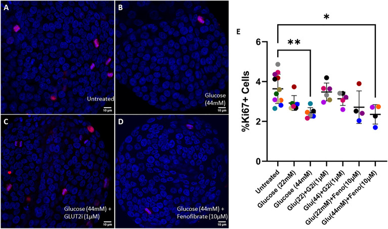 Diabetes mellitus (DM) is a common chronic metabolic disease in humans and household cats that is characterized by persistent hyperglycemia. DM is associated with dysfunction of the intestinal barrier. This barrier is comprised of an epithelial monolayer that contains a network of tight junctions that adjoin cells and regulate paracellular movement of water and solutes. The mechanisms driving DM-associated barrier dysfunction are multifaceted, and the direct effects of hyperglycemia on the epithelium are poorly understood. Preliminary data suggest that fenofibrate, An FDA-approved peroxisome proliferator-activated receptor-alpha (PPARα) agonist drug attenuates intestinal barrier dysfunction in dogs with experimentally-induced DM. We investigated the effects of hyperglycemia-like conditions and fenofibrate treatment on epithelial barrier function using feline intestinal organoids. We hypothesized that glucose treatment directly increases barrier permeability and alters tight junction morphology, and that fenofibrate administration can ameliorate these deleterious effects. We show that hyperglycemia-like conditions directly increase intestinal epithelial permeability, which is mitigated by fenofibrate. Moreover, increased permeability is caused by disruption of tight junctions, as evident by increased junctional tortuosity. Finally, we found that increased junctional tortuosity and barrier permeability in hyperglycemic conditions were associated with increased protein kinase C-α (PKCα) activity, and that fenofibrate treatment restored PKCα activity to baseline levels. We conclude that hyperglycemia directly induces barrier dysfunction by disrupting tight junction structure, a process that is mitigated by fenofibrate. We further propose that counteracting modulation of PKCα activation by increased intracellular glucose levels and fenofibrate is a key candidate regulatory pathway of tight junction structure and epithelial permeability.