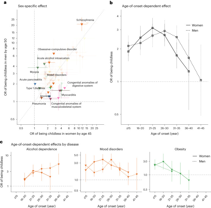 The percentage of people without children over their lifetime is approximately 25% in men and 20% in women. Individual diseases have been linked to childlessness, mostly in women, yet we lack a comprehensive picture of the effect of early-life diseases on lifetime childlessness. We examined all individuals born in 1956-1968 (men) and 1956-1973 (women) in Finland (n = 1,035,928) and Sweden (n = 1,509,092) to the completion of their reproductive lifespan in 2018. Leveraging nationwide registers, we associated sociodemographic and reproductive information with 414 diseases across 16 categories, using a population and matched-pair case-control design of siblings discordant for childlessness (71,524 full sisters and 77,622 full brothers). The strongest associations were mental-behavioural disorders (particularly among men), congenital anomalies and endocrine-nutritional-metabolic disorders (strongest among women). We identified new associations for inflammatory and autoimmune diseases. Associations were dependent on age at onset and mediated by singlehood and education. This evidence can be used to understand how disease contributes to involuntary childlessness.