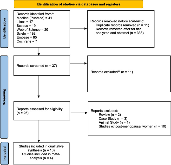 Results: Initially, 381 articles were found using the search strategy and 26 were read in full. After risk of bias analysis, 16 articles remained in the systematic review and four were included in the meta-analysis. The studies showed a reduction in bone mass in the lumbar spine in the first months postpartum (4 - 6 months), when compared with a longer period of breastfeeding (12-18 months). The breastfeeding group presented a greater impact in the meta-analysis than the control group (non-breastfeeding, pregnant, or immediate postpartum), with a reduction in BMD in the lumbar spine of -0.18 g/cm2 (-0.36, -0.01 g/cm2); 95% Confidence Interval, on a scale from 0 to 10.