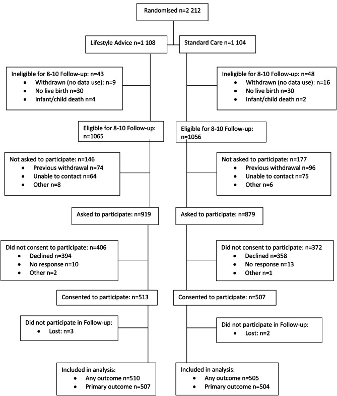 Results: We assessed 1,015 (Lifestyle Advice n = 510; Standard Care n = 505) (48%) of the 2,121 eligible children. BMI z-score > 85th percentile was similar for children of women in the dietary Lifestyle Advice Group compared with children of women in the Standard Care Group (Lifestyle Advice 479 (45%) versus Standard Care 507 (48%); adjusted RR (aRR) 0.93; 95% CI 0.82 to 1.06; p = 0.302) as were secondary outcomes. We observed that more than 45% of all the children had a BMI z-score > 85th percentile, consistent with findings from follow-up at earlier time-points, indicating an ongoing risk of overweight and obesity.