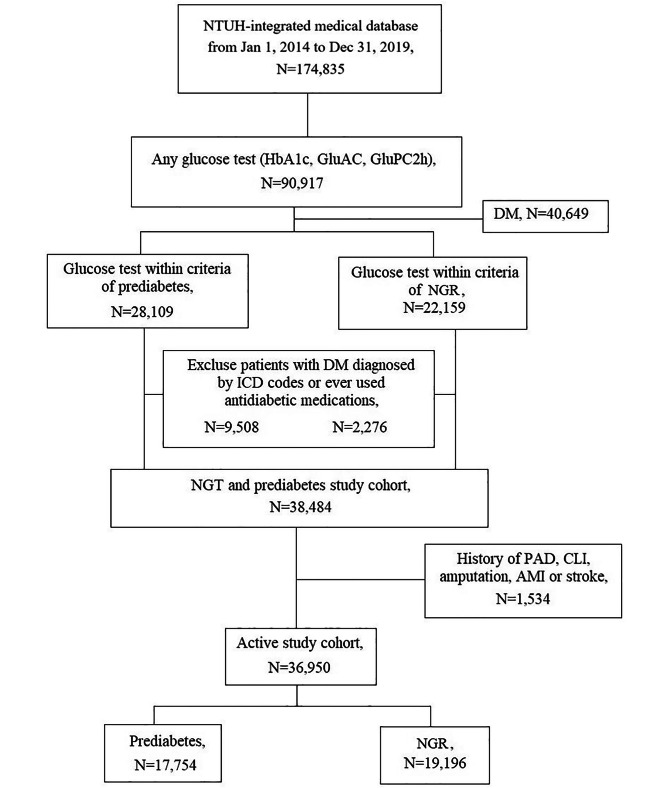 Methods: We conducted a retrospective cohort study involving 36,950 adult patients, utilizing electronic medical records from the National Taiwan University Hospital between 2014 and 2019. We employed multivariable Cox regression and Kaplan-Meier analysis with the log-rank test to analyze major adverse limb events (MALE) and major adverse cardiovascular events (MACE) in relation to normal glucose regulation (NGR) and prediabetes.