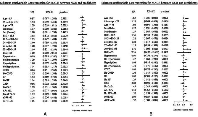Results: During the 131,783 person-years follow-up, 17,754 cases of prediabetes and 19,196 individuals with normal glucose regulation (NGR) were identified. Kaplan-Meier analysis revealed an increased incidence of both MALE and MACE in individuals with prediabetes. (log-rank p = 0.024 and < 0.001). Prediabetes exhibited a significant association with an elevated risk of MALE (adjusted hazard ratio (aHR) 1.26 [95% CI 1.10-1.46], p = 0.001) and MACE (aHR 1.46 [1.27-1.67], p < 0.001). Furthermore, in individuals with prediabetes, the elevation in the risk of MALE commenced before HbA1c levels surpassed 5.0% (for HbA1c 5.0-5.5%: aHR 1.78 (1.04-3.04), p = 0.036; HbA1c 5.5-6.0%: aHR 1.29 [1.06-1.58], p = 0.012; aHbA1c 6.0-6.5%: aHR 1.39 [1.14-1.70], p < 0.001). Similarly, the onset of increased MACE risk was observed when HbA1c levels exceeded 5.5% (for HbA1c 5.5-6.0%: aHR 1.67 [1.39-2.01], p < 0.001; HbA1c 6.0-6.5%: HR 2.10 [1.76-2.51], p < 0.001). Factors associated with both MALE and MACE in prediabetes include advanced age, male gender, higher body mass index, and a history of heart failure or atrial fibrillation.