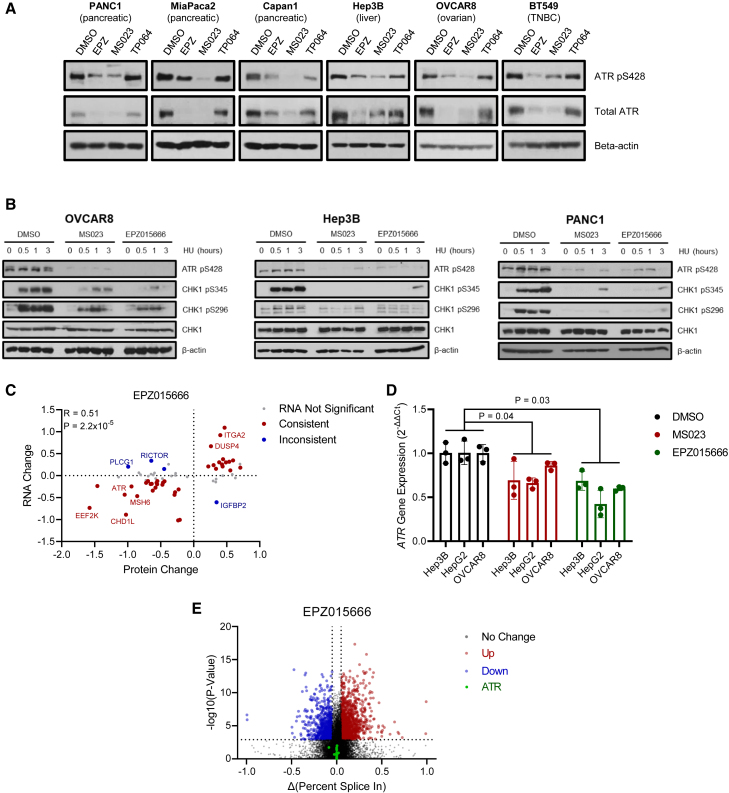 Multiple cancers exhibit aberrant protein arginine methylation by both type I arginine methyltransferases, predominately protein arginine methyltransferase 1 (PRMT1) and to a lesser extent PRMT4, and by type II PRMTs, predominately PRMT5. Here, we perform targeted proteomics following inhibition of PRMT1, PRMT4, and PRMT5 across 12 cancer cell lines. We find that inhibition of type I and II PRMTs suppresses phosphorylated and total ATR in cancer cells. Loss of ATR from PRMT inhibition results in defective DNA replication stress response activation, including from PARP inhibitors. Inhibition of type I and II PRMTs is synergistic with PARP inhibition regardless of homologous recombination function, but type I PRMT inhibition is more toxic to non-malignant cells. Finally, we demonstrate that the combination of PARP and PRMT5 inhibition improves survival in both BRCA-mutant and wild-type patient-derived xenografts without toxicity. Taken together, these results demonstrate that PRMT5 inhibition may be a well-tolerated approach to sensitize tumors to PARP inhibition.