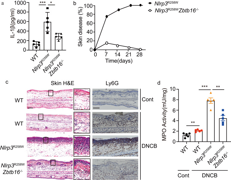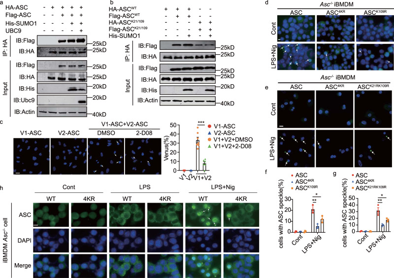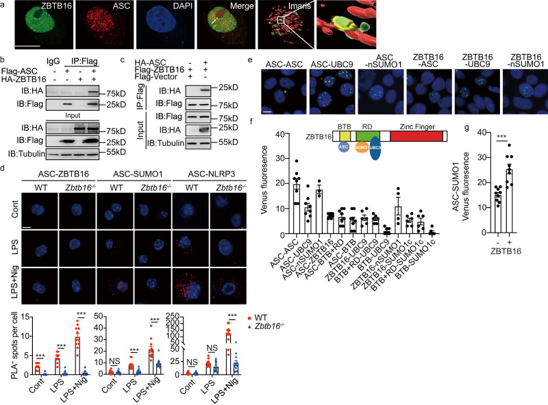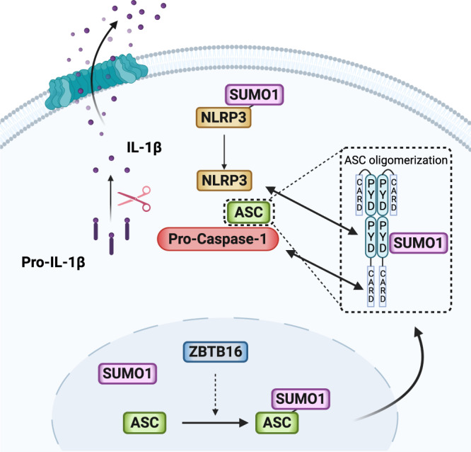 Inflammasome activity is important for the immune response and is instrumental in numerous clinical conditions. Here we identify a mechanism that modulates the central Caspase-1 and NLR (Nod-like receptor) adaptor protein ASC (apoptosis-associated speck-like protein containing a CARD). We show that the function of ASC in assembling the inflammasome is controlled by its modification with SUMO (small ubiquitin-like modifier) and identify that the nuclear ZBTB16 (zinc-finger and BTB domain-containing protein 16) promotes this SUMOylation. The physiological significance of this activity is demonstrated through the reduction of acute inflammatory pathogenesis caused by a constitutive hyperactive inflammasome by ablating ZBTB16 in a mouse model of Muckle-Wells syndrome. Together our findings identify an further mechanism by which ZBTB16-dependent control of ASC SUMOylation assembles the inflammasome to promote this pro-inflammatory response.