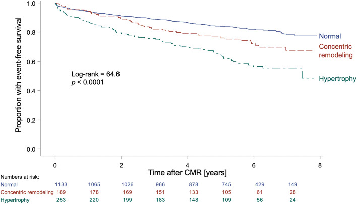 Cardiovascular magnetic resonance (CMR) can accurately measure left ventricular (LV) mass, and several measures related to LV wall thickness exist. We hypothesized that prognosis can be used to select an optimal measure of wall thickness for characterizing LV hypertrophy. Subjects having undergone CMR were studied (cardiac patients, n = 2543; healthy volunteers, n = 100). A new measure, global wall thickness (GT, GTI if indexed to body surface area) was accurately calculated from LV mass and end-diastolic volume. Among patients with follow-up (n = 1575, median follow-up 5.4 years), the most predictive measure of death or hospitalization for heart failure was LV mass index (LVMI) (hazard ratio (HR)[95% confidence interval] 1.16[1.12-1.20], p < 0.001), followed by GTI (HR 1.14[1.09-1.19], p < 0.001). Among patients with normal findings (n = 326, median follow-up 5.8 years), the most predictive measure was GT (HR 1.62[1.35-1.94], p < 0.001). GT and LVMI could characterize patients as having a normal LV mass and wall thickness, concentric remodeling, concentric hypertrophy, or eccentric hypertrophy, and the three abnormal groups had worse prognosis than the normal group (p < 0.05 for all). LV mass is highly prognostic when mass is elevated, but GT is easily and accurately calculated, and adds value and discrimination amongst those with normal LV mass (early disease).