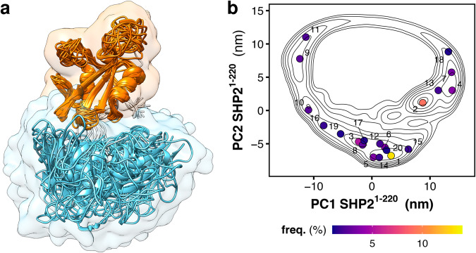 SHP2 phosphatase plays an important role in regulating several intracellular signaling pathways. Pathogenic mutations of SHP2 cause developmental disorders and are linked to hematological malignancies and cancer. SHP2 comprises two tandemly-arranged SH2 domains, a catalytic PTP domain, and a disordered C-terminal tail. Under physiological, non-stimulating conditions, the catalytic site of PTP is occluded by the N-SH2 domain, so that the basal activity of SHP2 is low. Whereas the autoinhibited structure of SHP2 has been known for two decades, its active, open structure still represents a conundrum. Since the oncogenic mutant SHP2E76K almost completely populates the active, open state, this mutant has been extensively studied as a model for activated SHP2. By molecular dynamics simulations and accurate explicit-solvent SAXS curve predictions, we present the heterogeneous atomistic ensemble of constitutively active SHP2E76K in solution, encompassing a set of conformational arrangements and radii of gyration in agreement with experimental SAXS data.