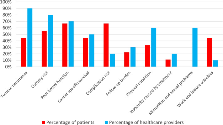 Results: Patients addressed the following relevant factors: the risk of an ostomy, risk of poor bowel function and treatment related complications. Healthcare providers emphasized oncological outcomes as tumour recurrence, risk of an ostomy and poor bowel function. Patients perceived absolute risks of adverse outcome to be lower than healthcare providers and were quite willing undergo organ preservation to achieve a better prospect of quality of life.