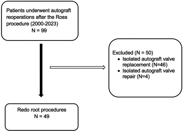 Methods: Between 2015 and 2023, 49 patients underwent redo root surgery in our institution. Autograft valve-sparing procedures (VSP) were performed in 20 cases and the Bentall procedure (BP) in 29 patients. The short and long-term clinical outcomes along with echocardiographic results of VSP and BP were investigated.