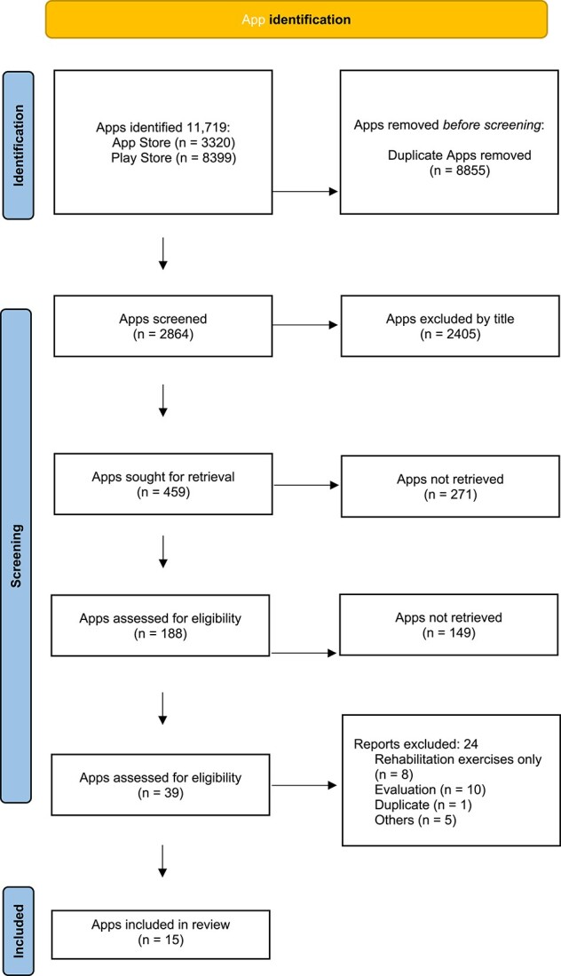 Methods: In-house, we developed an application that makes both the Apple app Store and the Google Play Store searchable using topic-related keywords and facilitates the extraction of basic app-information of the search results. The study was aimed at apps available to an English-speaking market. The resulting apps were filtered using various inclusion and exclusion criteria. The resultant apps underwent a more in-depth characterisation and searches for scientific publications on each app website and PubMed.