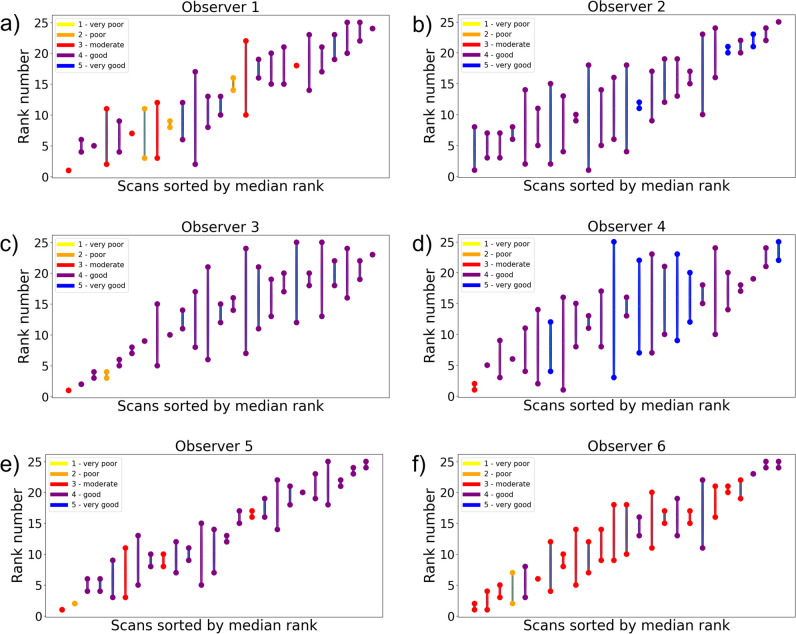 Methods: Abdominal CT scans (single-center) were retrospectively selected between September 2019 and February 2020 in a prior study. Sample variance in IQ was obtained by adding artificial noise using dedicated reconstruction software, including reconstructions with filtered backprojection and varying iterative reconstruction strengths. Two datasets (each n = 50) were composed with either higher or lower IQ variation with the 25 original scans being part of both datasets. Using in-house developed software, six observers (five radiologists, one resident) rated both datasets via both the PC method (forcing observers to choose preferred scans out of pairs of scans resulting in a ranking) and a 5-point Likert scale. The PC method was optimized using a sorting algorithm to minimize necessary comparisons. The inter- and intraobserver agreements were assessed for both methods with the intraclass correlation coefficient (ICC).