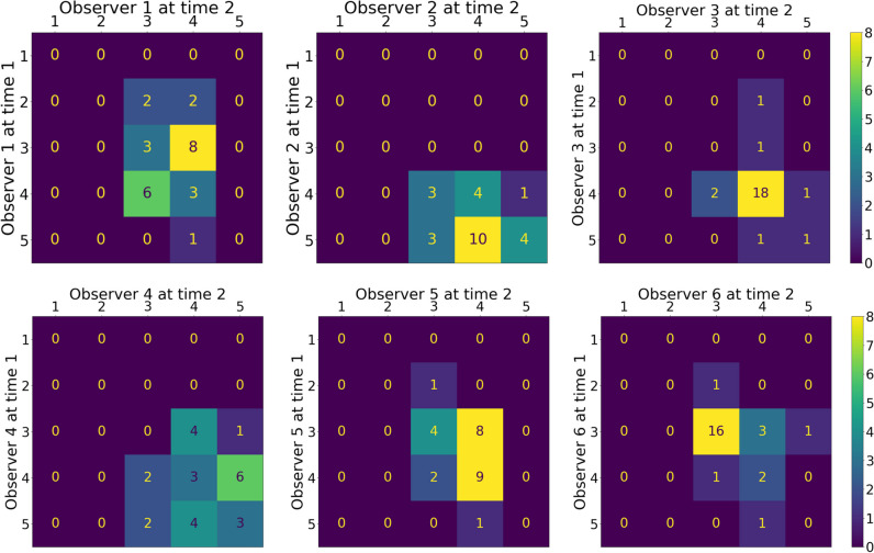 Results: Twenty-five patients (mean age 61 years ± 15.5; 56% men) were evaluated. The ICC for interobserver agreement for the high-variation dataset increased from 0.665 (95%CI 0.396-0.814) to 0.785 (95%CI 0.676-0.867) when the PC method was used instead of a Likert scale. For the low-variation dataset, the ICC increased from 0.276 (95%CI 0.034-0.500) to 0.562 (95%CI 0.337-0.729). Intraobserver agreement increased for four out of six observers.