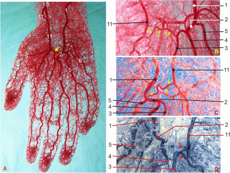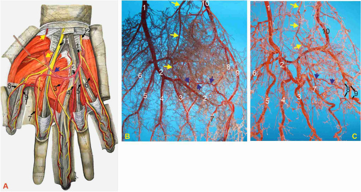 Microvascular surgery, plastic and reconstructive hand surgery, and coronary artery bypass surgery call for a microanatomical study of the branching pattern of the superficial palmar arch (SPA). For the anatomical analysis, we used a group of 20 dissected human hands injected with 4% formaldehyde solution and a 10% mixture of melted gelatin and India ink. The morphometric study was performed on 40 human hands of adult persons injected with methyl-methacrylate fluid into the ulnar and radial arteries simultaneously and afterwards corroded in 40% KOH solution for the preparation of corrosion cast specimens. The mean diameter of the SPA, between the second and third common palmar digital arteries, was 1.86 ± 0.08 mm. We identified the persistent median artery (PMA) in 5% of hands. We distinguished the three main groups of the SPAs according to variations in morphology and branching of the arch: Type 1, the long SPA; Type 2, the middle length SPA; and Type 3, the short SPA found in 27.5% of specimens. The communicating branch (CB), a vessel interconnecting the SPA to the closest branch of the radial artery, is classified into two different morphological groups. The third type of incomplete short arterial arch is the most important of the three groups of SPAs. That short SPA is potentially inadequate for restoring circulation after occlusion or radial artery harvesting for coronary artery bypass.