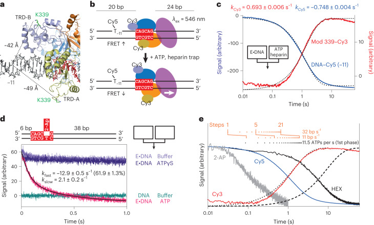 Cleavage of bacteriophage DNA by the Type III restriction-modification enzymes requires long-range interaction between DNA sites. This is facilitated by one-dimensional diffusion ('DNA sliding') initiated by ATP hydrolysis catalyzed by a superfamily 2 helicase-like ATPase. Here we combined ultrafast twist measurements based on plasmonic DNA origami nano-rotors with stopped-flow fluorescence and gel-based assays to examine the role(s) of ATP hydrolysis. Our data show that the helicase-like domain has multiple roles. First, this domain stabilizes initial DNA interactions alongside the methyltransferase subunits. Second, it causes environmental changes in the flipped adenine base following hydrolysis of the first ATP. Finally, it remodels nucleoprotein interactions via constrained translocation of a ∼ 5 to 22-bp double stranded DNA loop. Initiation of DNA sliding requires 8-15 bp of DNA downstream of the motor, corresponding to the site of nuclease domain binding. Our data unify previous contradictory communication models for Type III enzymes.