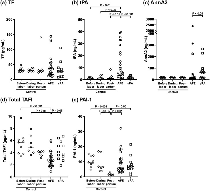 Amniotic fluid embolism (AFE) and placental abruption (PA) are typical obstetric diseases associated with disseminated intravascular coagulation (DIC). AFE is more likely to be complicated with enhanced fibrinolysis than PA. AFE may have an additional mechanism activating fibrinolytic cascade. We aimed to compare the coagulation/fibrinolysis factors among AFE, PA, and peripartum controls. We assessed AFE cases registered in the Japanese AFE Registry, and PA cases complicated with DIC (severe PA) and peripartum controls recruited at our hospital. The following factors in plasma were compared: prothrombin fragment 1 + 2 (PF1 + 2), plasmin α2-plasmin inhibitor complex (PIC), tissue factor (TF), tissue plasminogen activator (tPA), annexin A2 (AnnA2), total thrombin activatable fibrinolysis inhibitor (TAFI) including its activated form (TAFIa), and plasminogen activator inhibitor-type 1 (PAI-1). PF1 + 2 and PIC were markedly increased in both AFE (n = 27) and severe PA (n = 12) compared to controls (n = 23), without significant difference between those disease groups; however, PIC in AFE showed a tendency to elevate relative to PF1 + 2, compared with severe PA. AFE had significantly increased tPA and decreased total TAFI levels compared with severe PA and controls, which might be associated with further plasmin production in AFE and underlie its specific fibrinolytic activation pathway.