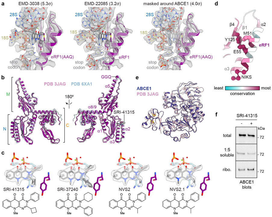 Translation termination is an essential cellular process, which is also of therapeutic interest for diseases that manifest from premature stop codons. In eukaryotes, translation termination requires eRF1, which recognizes stop codons, catalyzes the release of nascent proteins from ribosomes and facilitates ribosome recycling. The small molecule SRI-41315 triggers eRF1 degradation and enhances translational readthrough of premature stop codons. However, the mechanism of action of SRI-41315 on eRF1 and translation is not known. Here we report cryo-EM structures showing that SRI-41315 acts as a metal-dependent molecular glue between the N domain of eRF1 responsible for stop codon recognition and the ribosomal subunit interface near the decoding center. Retention of eRF1 on ribosomes by SRI-41315 leads to ribosome collisions, eRF1 ubiquitylation and a higher frequency of translation termination at near-cognate stop codons. Our findings reveal a new mechanism of release factor inhibition and additional implications for pharmacologically targeting eRF1.