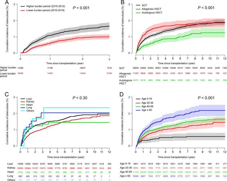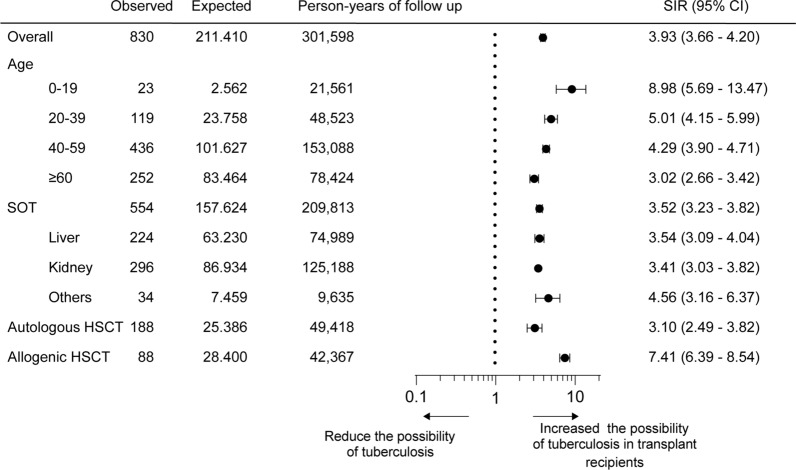 Results: Of 57,103 recipients analyzed, the overall cumulative incidence rate 1 year after transplantation was 0.8% (95% confidence interval [CI]: 0.7-0.8), significantly higher in the higher-burden period than in the lower-burden period (1.7% vs. 1.0% 3 years after transplantation, P < 0.001). Individuals who underwent allogeneic hematopoietic stem cell transplantation had the highest tuberculosis incidence, followed by those who underwent solid organ transplantation and autologous hematopoietic stem cell transplantation (P < 0.001). The overall standardized incidence ratio was 3.9 (95% CI 3.7-4.2) and was the highest in children aged 0-19 years, at 9.0 (95% CI 5.7-13.5). Male sex, older age, tuberculosis history, liver transplantation, and allogeneic hematopoietic stem cell transplantation were risk factors for tuberculosis.