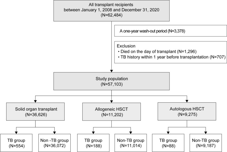 Methods: This retrospective study was conducted based on the South Korean health insurance review and assessment database among those who underwent transplantation (62,484 recipients) between 2008 and 2020. Tuberculosis incidence was compared in recipients treated during higher- (2010-2012) and lower-disease burden (2016-2018) periods. Standardized incidence ratios were analyzed using the Korean Tuberculosis Surveillance System. The primary outcome was the number of new tuberculosis cases after transplantation.