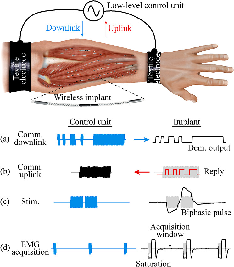 Methods: A proof-of-concept device, consisting of implantable thin-film electrodes and a nonimplantable miniature electronic circuit connected to them, was deployed in the upper or lower limb of six healthy participants. Two external electrodes were strapped around the limb and were connected to the external system which delivered high frequency current bursts. Within these bursts, 13 commands were modulated to communicate with the implant.
