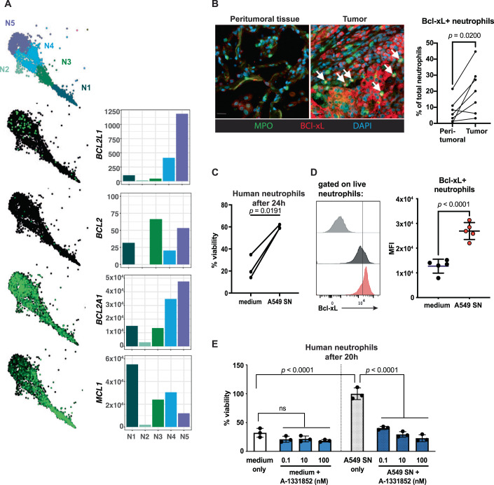 Elevated peripheral blood and tumor-infiltrating neutrophils are often associated with a poor patient prognosis. However, therapeutic strategies to target these cells are difficult to implement due to the life-threatening risk of neutropenia. In a genetically engineered mouse model of lung adenocarcinoma, tumor-associated neutrophils (TAN) demonstrate tumor-supportive capacities and have a prolonged lifespan compared to circulating neutrophils. Here, we show that tumor cell-derived GM-CSF triggers the expression of the anti-apoptotic Bcl-xL protein and enhances neutrophil survival through JAK/STAT signaling. Targeting Bcl-xL activity with a specific BH3 mimetic, A-1331852, blocked the induced neutrophil survival without impacting their normal lifespan. Specifically, oral administration with A-1331852 decreased TAN survival and abundance, and reduced tumor growth without causing neutropenia. We also show that G-CSF, a drug used to combat neutropenia in patients receiving chemotherapy, increased the proportion of young TANs and augmented the anti-tumor effect resulting from Bcl-xL blockade. Finally, our human tumor data indicate the same role for Bcl-xL on pro-tumoral neutrophil survival. These results altogether provide preclinical evidence for safe neutrophil targeting based on their aberrant intra-tumor longevity.