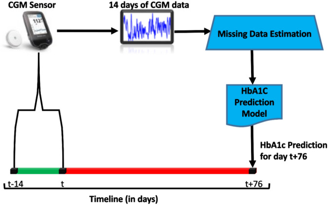 Regular monitoring of glycated hemoglobin (HbA1c) levels is important for the proper management of diabetes. Studies demonstrated that lower levels of HbA1c play an essential role in reducing or delaying microvascular difficulties that arise from diabetes. In addition, there is an association between elevated HbA1c levels and the development of diabetes-related comorbidities. The advanced prediction of HbA1c enables patients and physicians to make changes to treatment plans and lifestyle to avoid elevated HbA1c levels, which can consequently lead to irreversible health complications. Despite the impact of such prediction capabilities, no work in the literature or industry has investigated the futuristic prediction of HbA1c using current blood glucose (BG) measurements. For the first time in the literature, this work proposes a novel FSL-derived algorithm for the long-term prediction of clinical HbA1c measures. More importantly, the study specifically targeted the pediatric Type-1 diabetic population, as an early prediction of elevated HbA1c levels could help avert severe life-threatening complications in these young children. Short-term CGM time-series data are processed using both novel image transformation approaches, as well as using conventional signal processing methods. The derived images are then fed into a convolutional neural network (CNN) adapted from a few-shot learning (FSL) model for feature extraction, and all the derived features are fused together. A novel normalized FSL-distance (FSLD) metric is proposed for accurately separating the features of different HbA1c levels. Finally, a K-nearest neighbor (KNN) model with majority voting is implemented for the final classification task. The proposed FSL-derived algorithm provides a prediction accuracy of 93.2%.