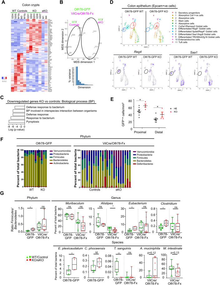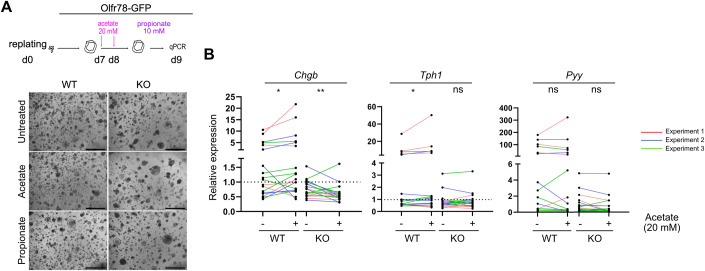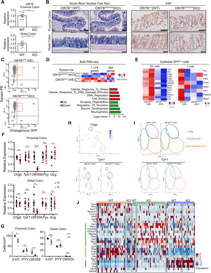 The gastrointestinal epithelium constitutes a chemosensory system for microbiota-derived metabolites such as short-chain fatty acids (SCFA). Here, we investigate the spatial distribution of Olfr78, one of the SCFA receptors, in the mouse intestine and study the transcriptome of colon enteroendocrine cells expressing Olfr78. The receptor is predominantly detected in the enterochromaffin and L subtypes in the proximal and distal colon, respectively. Using the Olfr78-GFP and VilCre/Olfr78flox transgenic mouse lines, we show that loss of epithelial Olfr78 results in impaired enterochromaffin cell differentiation, blocking cells in an undefined secretory lineage state. This is accompanied by a reduced defense response to bacteria in colon crypts and slight dysbiosis. Using organoid cultures, we further show that maintenance of enterochromaffin cells involves activation of the Olfr78 receptor via the SCFA ligand acetate. Taken together, our work provides evidence that Olfr78 contributes to colon homeostasis by promoting enterochromaffin cell differentiation.