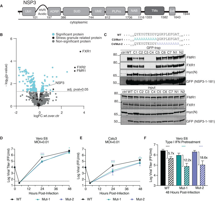 Viruses interact with numerous host factors to facilitate viral replication and to dampen antiviral defense mechanisms. We currently have a limited mechanistic understanding of how SARS-CoV-2 binds host factors and the functional role of these interactions. Here, we uncover a novel interaction between the viral NSP3 protein and the fragile X mental retardation proteins (FMRPs: FMR1, FXR1-2). SARS-CoV-2 NSP3 mutant viruses preventing FMRP binding have attenuated replication in vitro and reduced levels of viral antigen in lungs during the early stages of infection. We show that a unique peptide motif in NSP3 binds directly to the two central KH domains of FMRPs and that this interaction is disrupted by the I304N mutation found in a patient with fragile X syndrome. NSP3 binding to FMRPs disrupts their interaction with the stress granule component UBAP2L through direct competition with a peptide motif in UBAP2L to prevent FMRP incorporation into stress granules. Collectively, our results provide novel insight into how SARS-CoV-2 hijacks host cell proteins and provides molecular insight into the possible underlying molecular defects in fragile X syndrome.