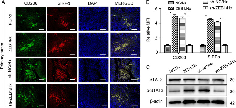 Results: Our previous study showed that hypoxia increased the expression of ZEB1 in cervical squamous cell carcinoma (CSCC) cells, which resulted in increased infiltration of TAMs. Here, we found that hypoxia-induced ZEB1 expression is closely correlated with CD47-SIRPα axis activity in CSCC, which enables cancer cells to evade phagocytosis by macrophages and promotes tumour progression. ZEB1 was found to directly activate the transcription of the CD47 gene in hypoxic CSCC cells. We further showed that endogenous ZEB1 was characteristically enriched in hypoxic CSCC cell-derived exosomes and transferred into macrophages via these exosomes to promote SIRPα+ TAM polarization. Intriguingly, exosomal ZEB1 retained transcriptional activity and reprogrammed SIRPα+ TAMs via activation of the STAT3 signalling pathway in vitro and in vivo. STAT3 inhibition reduced the polarizing effect induced by exosomal ZEB1. Knockdown of ZEB1 increased the phagocytosis of CSCC cells by macrophages via decreasing CD47 and SIRPα expression.