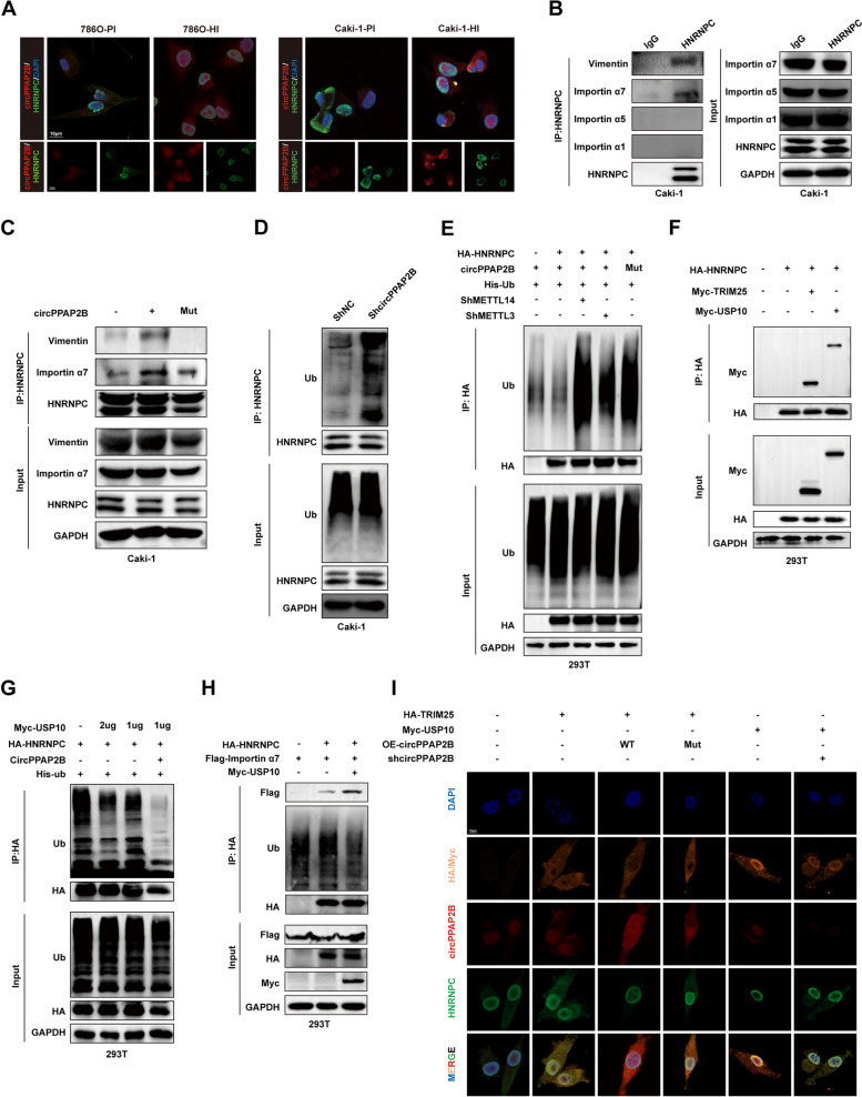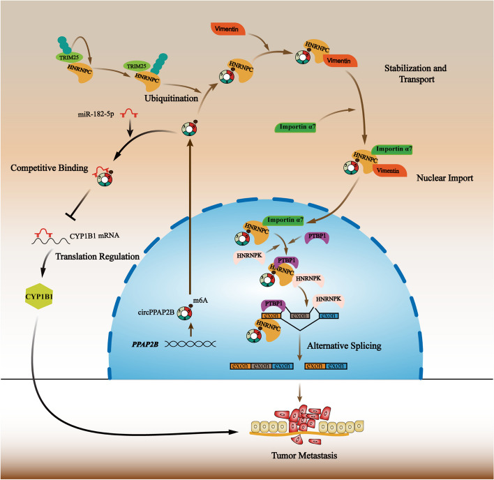 Results: In this study, we describe a newly identified circular RNA called circPPAP2B, which is overexpressed in highly invasive ccRCC cells, as determined through advanced high-throughput RNA sequencing techniques. Furthermore, we observed elevated circPPAP2B in ccRCC tissues, particularly in metastatic ccRCC tissues, and found it to be associated with poor prognosis. Functional experiments unveiled that circPPAP2B actively stimulates the proliferation and metastatic capabilities of ccRCC cells. Mechanistically, circPPAP2B interacts with HNRNPC in a m6A-dependent manner to facilitate HNRNPC nuclear translocation. Subcellular relocalization was dependent upon nondegradable ubiquitination of HNRNPC and stabilization of an HNRNPC/Vimentin/Importin α7 ternary complex. Moreover, we found that circPPAP2B modulates the interaction between HNRNPC and splicing factors, PTBP1 and HNPNPK, and regulates pre-mRNA alternative splicing. Finally, our studies demonstrate that circPPAP2B functions as a miRNA sponge to directly bind to miR-182-5p and increase CYP1B1 expression in ccRCC.