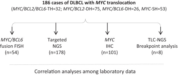 MYC translocation occurs in 8-14% of diffuse large B-cell lymphoma (DLBCL), and may concur with BCL2 and/or BCL6 translocation, known as double-hit (DH) or triple-hit (TH). DLBCL-MYC/BCL2-DH/TH are largely germinal centre B-cell like subtype, but show variable clinical outcome, with IG::MYC fusion significantly associated with inferior survival. While DLBCL-MYC/BCL6-DH are variable in their cell-of-origin subtypes and clinical outcome. Intriguingly, only 40-50% of DLBCL with MYC translocation show high MYC protein expression (>70%). We studied 186 DLBCLs with MYC translocation including 32 MYC/BCL2/BCL6-TH, 75 MYC/BCL2-DH and 26 MYC/BCL6-DH. FISH revealed a MYC/BCL6 fusion in 59% of DLBCL-MYC/BCL2/BCL6-TH and 27% of DLBCL-MYC/BCL6-DH. Targeted NGS showed a similar mutation profile and LymphGen genetic subtype between DLBCL-MYC/BCL2/BCL6-TH and DLBCL-MYC/BCL2-DH, but variable LymphGen subtypes among DLBCL-MYC/BCL6-DH. MYC protein expression is uniformly high in DLBCL with IG::MYC, but variable in those with non-IG::MYC including MYC/BCL6-fusion. Translocation breakpoint analyses of 8 cases by TLC-based NGS showed no obvious genomic configuration that enables MYC transactivation in 3 of the 4 cases with non-IG::MYC, while a typical promoter substitution or IGH super enhancer juxtaposition in the remaining cases. The findings potentially explain variable MYC expression in DLBCL with MYC translocation, and also bear practical implications in its routine assessment.