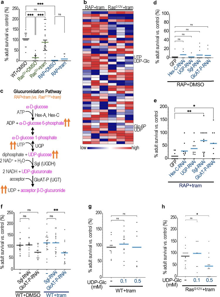 Colorectal cancer (CRC) is the second most deadly cancer worldwide. One key reason is the failure of therapies that target RAS proteins, which represent approximately 40% of CRC cases. Despite the recent discovery of multiple alternative signalling pathways that contribute to resistance, durable therapies remain an unmet need. Here, we use liquid chromatography/mass spectrometry (LC/MS) analyses on Drosophila CRC tumour models to identify multiple metabolites in the glucuronidation pathway-a toxin clearance pathway-as upregulated in trametinib-resistant RAS/APC/P53 ("RAP") tumours compared to trametinib-sensitive RAS G12V tumours. Elevating glucuronidation was sufficient to direct trametinib resistance in RAS G12V animals while, conversely, inhibiting different steps along the glucuronidation pathway strongly reversed RAP resistance to trametinib. For example, blocking an initial HDAC1-mediated deacetylation step with the FDA-approved drug vorinostat strongly suppressed trametinib resistance in Drosophila RAP tumours. We provide functional evidence that pairing oncogenic RAS with hyperactive WNT activity strongly elevates PI3K/AKT/GLUT signalling, which in turn directs elevated glucose and subsequent glucuronidation. Finally, we show that this mechanism of trametinib resistance is conserved in an KRAS/APC/TP53 mouse CRC tumour organoid model. Our observations demonstrate a key mechanism by which oncogenic RAS/WNT activity promotes increased drug clearance in CRC. The majority of targeted therapies are glucuronidated, and our results provide a specific path towards abrogating this resistance in clinical trials.