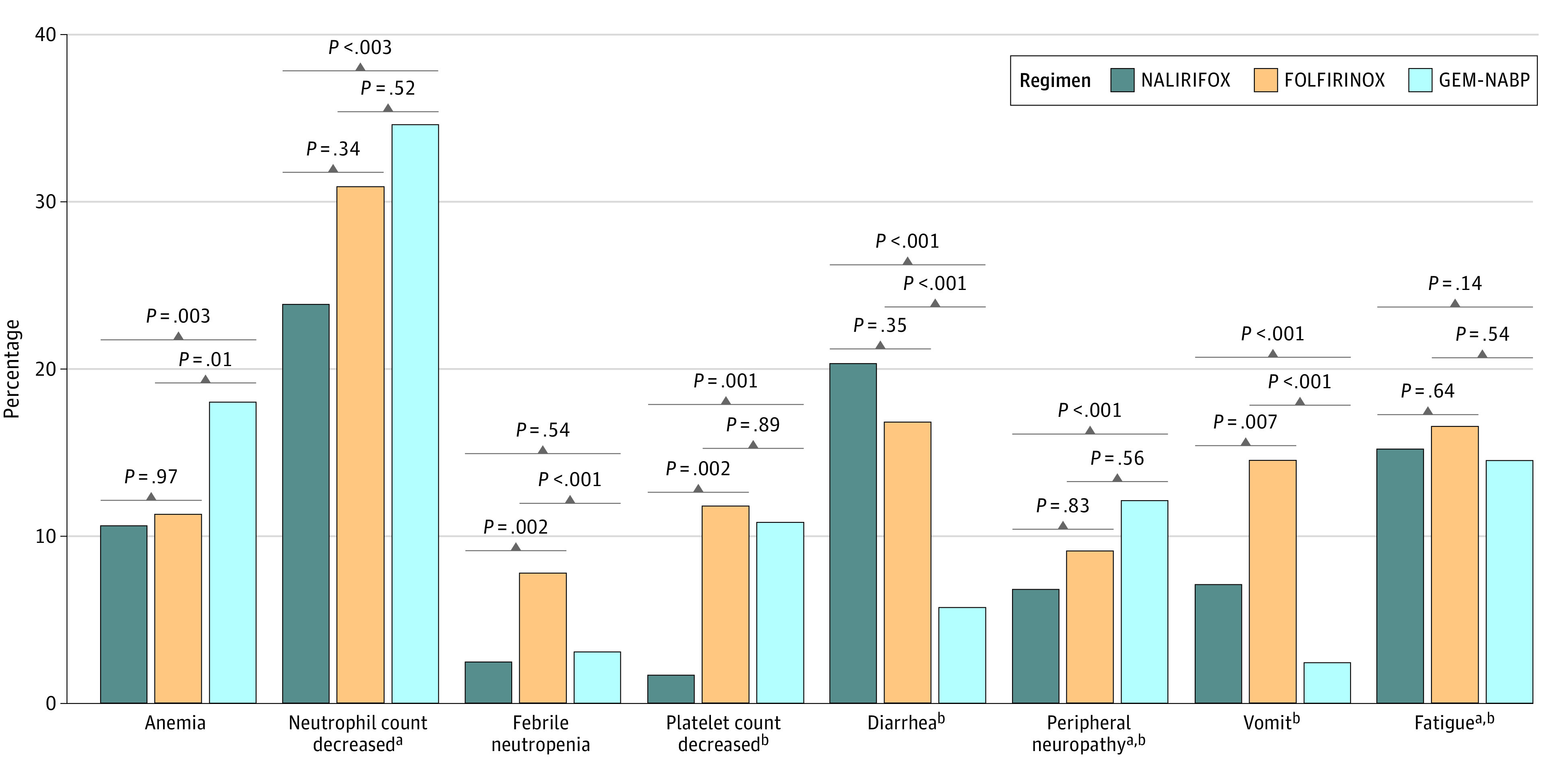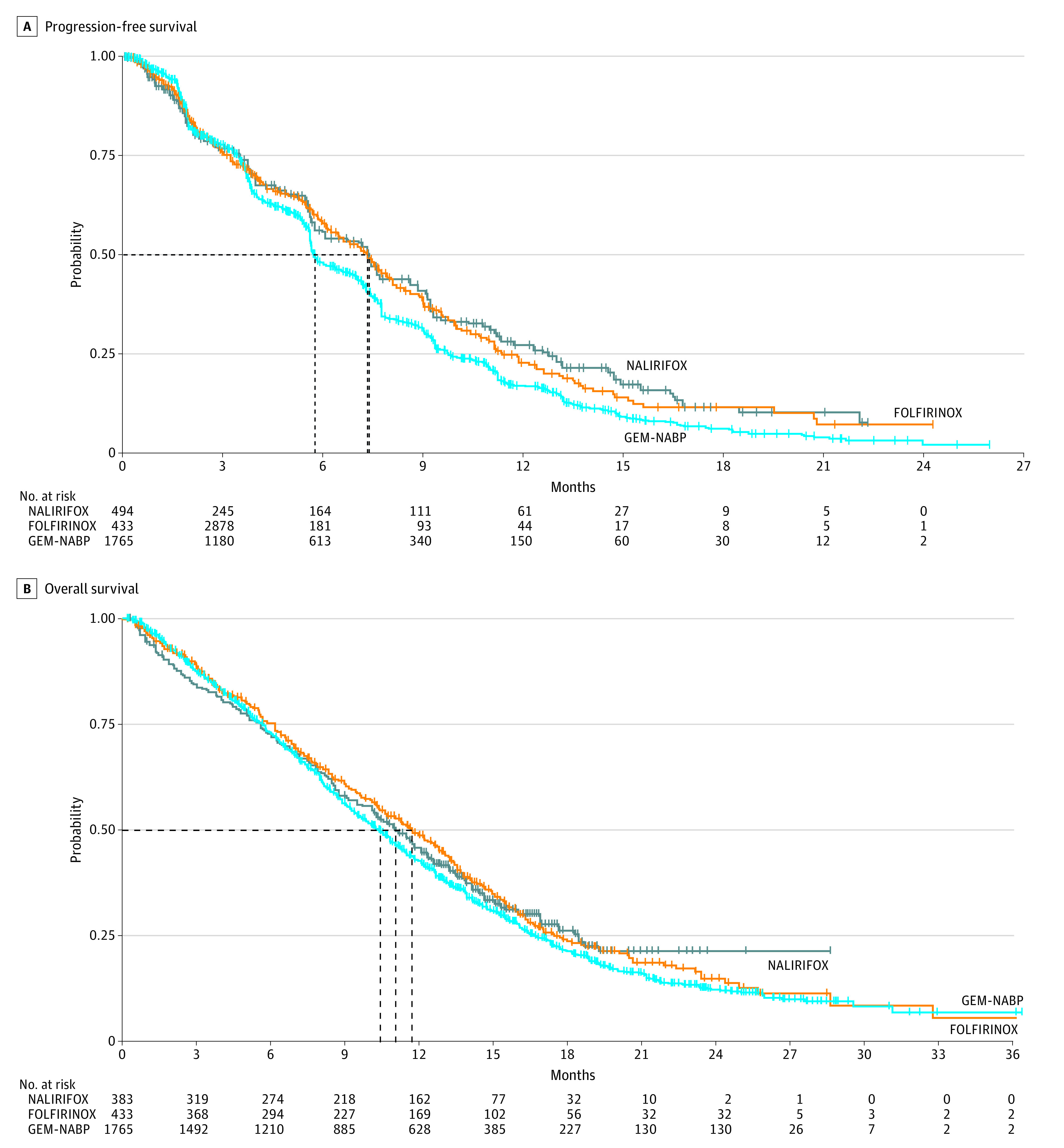 Results: A total of 7 trials with data on 2581 patients were analyzed, including 383 patients treated with NALIRIFOX, 433 patients treated with FOLFIRINOX, and 1756 patients treated with GEM-NABP. Median PFS was longer in patients treated with NALIRIFOX (7.4 [95% CI, 6.1-7.7] months) or FOLFIRINOX (7.3 [95% CI, 6.5-7.9] months; [HR], 1.21 [95% CI, 0.86-1.70]; P = .28) compared with patients treated with GEM-NABP (5.7 [95% CI, 5.6-6.1] months; HR vs NALIRIFOX, 1.45 [95% CI, 1.22-1.73]; P < .001). Similarly, GEM-NABP was associated with poorer OS (10.4 [95% CI, 9.8-10.8]; months) compared with NALIRIFOX (HR, 1.18 [95% CI, 1.00-1.39]; P = .05], while no difference was observed between FOLFIRINOX (11.7 [95% CI, 10.4-13.0] months) and NALIRIFOX (11.1 [95% CI, 10.1-12.3] months; HR, 1.06 [95% CI, 0.81-1.39]; P = .65). There were no statistically significant differences in ORR among NALIRIFOX (41.8%), FOLFIRINOX (31.6%), and GEM-NABP (35.0%). NALIRIFOX was associated with lower incidence of grade 3 or higher hematological toxic effects (eg, platelet count decreased 1.6% vs 11.8% with FOLFIRINOX and 10.8% with GEM-NABP), but higher rates of severe diarrhea compared with GEM-NABP (20.3% vs 15.7%).