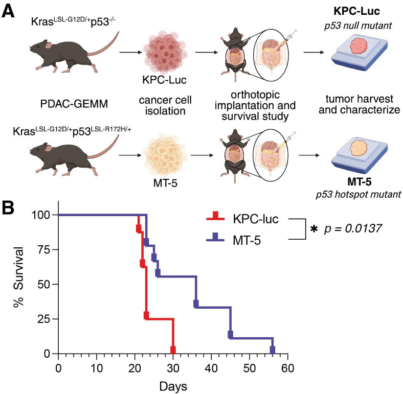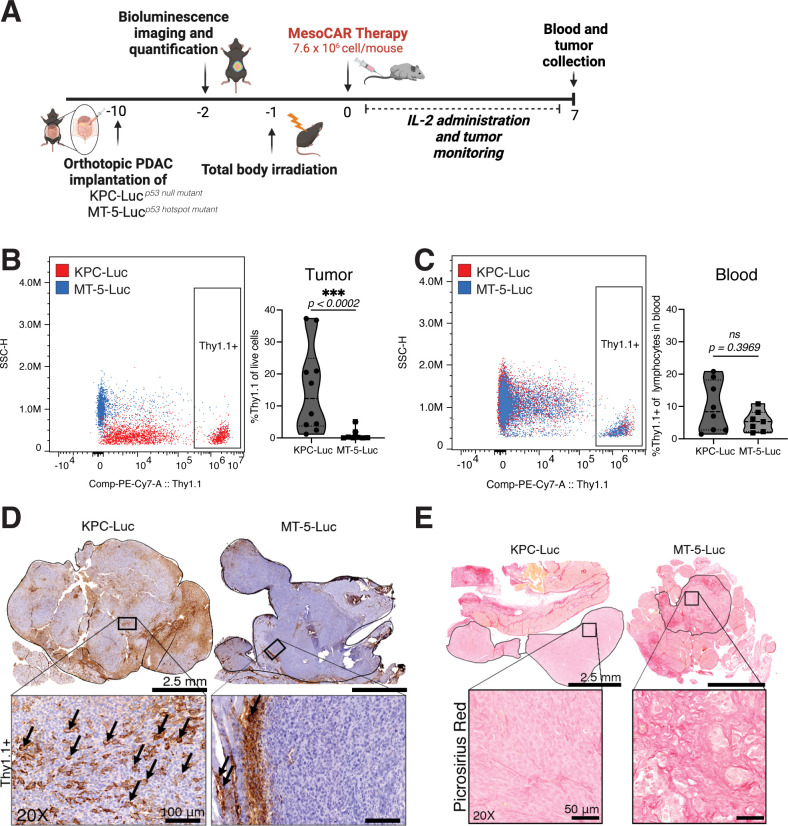 Results: The MT-5 orthotopic model best recapitulates the cellular and stromal features of the TME in the PDAC GEMM. In contrast, far more host immune cells infiltrate the KPC-Luc tumors, which have less stroma, although CD4+ and CD8+ T cells were similarly detected in the MT-5 tumors compared with KPC-GEMM in mice. Interestingly, we found that chimeric antigen receptor (CAR) T cells redirected to recognize mesothelin on these tumors that signal via CD3ζ and 41BB (Meso-41BBζ-CAR T cells) infiltrated the tumors of mice bearing stroma-devoid KPC-Luc orthotopic tumors, but not MT-5 tumors.