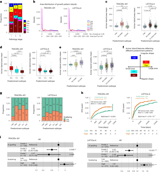 The introduction of the International Association for the Study of Lung Cancer grading system has furthered interest in histopathological grading for risk stratification in lung adenocarcinoma. Complex morphology and high intratumoral heterogeneity present challenges to pathologists, prompting the development of artificial intelligence (AI) methods. Here we developed ANORAK (pyrAmid pooliNg crOss stReam Attention networK), encoding multiresolution inputs with an attention mechanism, to delineate growth patterns from hematoxylin and eosin-stained slides. In 1,372 lung adenocarcinomas across four independent cohorts, AI-based grading was prognostic of disease-free survival, and further assisted pathologists by consistently improving prognostication in stage I tumors. Tumors with discrepant patterns between AI and pathologists had notably higher intratumoral heterogeneity. Furthermore, ANORAK facilitates the morphological and spatial assessment of the acinar pattern, capturing acinus variations with pattern transition. Collectively, our AI method enabled the precision quantification and morphology investigation of growth patterns, reflecting intratumoral histological transitions in lung adenocarcinoma.