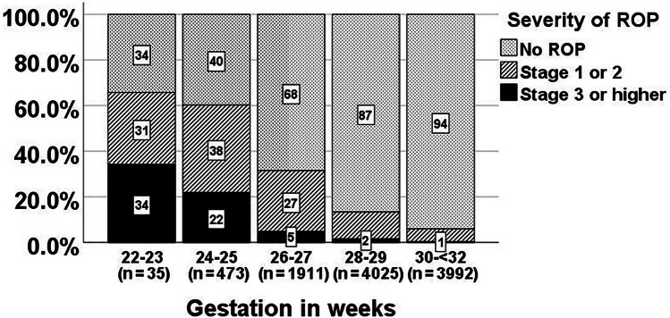 Conclusions: The incidence and severity of ROP increased with decreasing gestation and birthweight. Prolonged duration of oxygen therapy, infection, invasive respiratory support, and conditions commonly causing fluctuations of oxygenation were significant factors associated with increased risk of ROP. Receiving oxygen at birth did not increase risk.