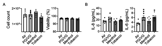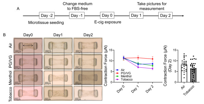 Method: We exposed lung fibroblast (HFL-1) and epithelium (BEAS-2B) to Air, PG/VG, menthol flavored, or tobacco-flavored e-cig, and determined the cytotoxicity, inflammation, and wound healing ability in 2D cells and 3D microtissue chip models.