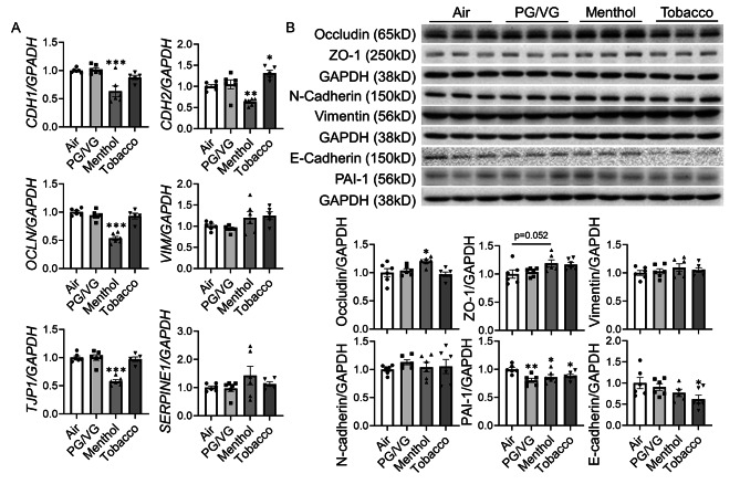 Results: After exposure, HFL-1 showed decreased cell number with increased IL-8 levels in the tobacco flavor group compared to air. BEAS-2B also showed increased IL-8 secretion after PG/VG and tobacco flavor exposure, while menthol flavor exposure showed no change. Both menthol and tobacco-flavored e-cig exposure showed decreased protein abundance of type 1 collagen α 1 (COL1A1), α-smooth-muscle actin (αSMA), and fibronectin as well as decreased gene expression level of αSMA (Acta2) in HFL-1. After tobacco flavor e-cig exposure, HFL-1 mediated wound healing and tissue contractility were inhibited. Furthermore, BEAS-2B exposed to menthol flavor showed significantly decreased tight junction gene expressions, such as CDH1, OCLN, and TJP1.