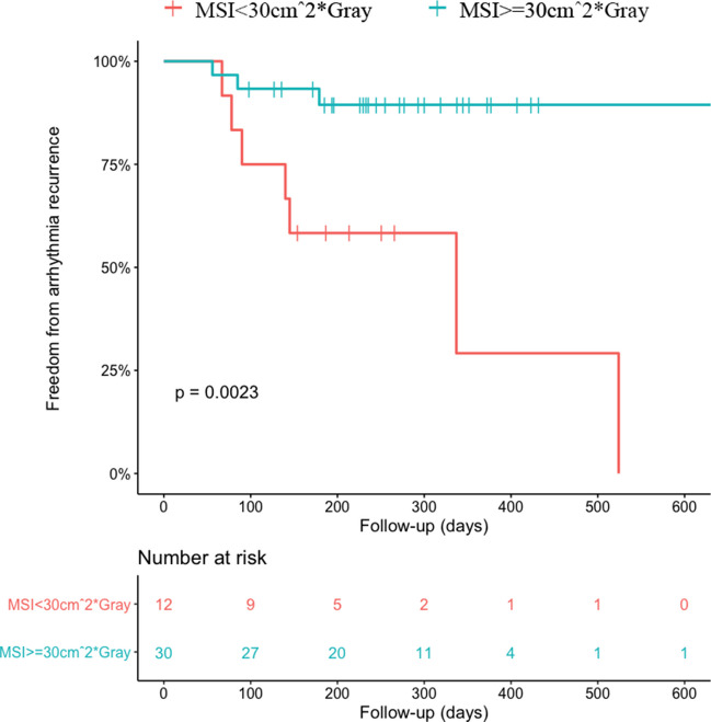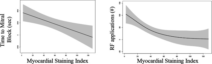 Results: In total, 42 patients out of 49 (85.8%) had an identifiable VOM. MI block was successfully achieved in 35 patients out of 42 (83.3%). MSI was significantly associated with the occurrence of MI block (OR 1.24 (1.03-1.48); p = 0.022). A higher MSI resulted in reduced ablation time (p = 0.014) and reduced radiofrequency applications (p = 0.002) to obtain MI block. MSI was also associated with MI block obtained by endocardial ablation only (OR 1.07 (1.02-1.13); p = 0.002). MSI was highly correlated with newly formed LVZ extension (r = 0.776; p = 0.001).