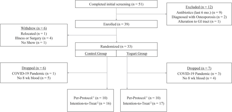 Objective: The primary objective of this study was to determine whether consuming 5 oz of yogurt daily for 8wks improves bone turnover markers (BTMs) among Caribbean Latino adults > 50 years; and secondarily to determine the impact on the gut microbiota and markers of intestinal integrity and inflammation.