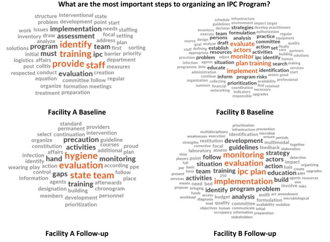 Results: Twenty-two and twenty-four participants were trained at each facility, respectively. Baseline and follow-up KAP results suggested increases in knowledge related to the necessity of a dedicated IPC focal person and annual evaluations of IPC training although lack of recognition on the importance of including hospital leadership in IPC training and hand hygiene monitoring recommendations remained. Most participants reported rarely attending IPC meetings or participating in IPC action planning although attitudes shifted towards stronger agreement with the feeling of IPC responsibility and importance of an IPC team. A reocurring theme in plenary discussions was related to limited resources as a barrier to IPC implementation, namely lack of reliable water access. However, participants recognised the importance of IPC improvement efforts such as practical IPC training methods or the use of data to improve quality of care. The facilities' IPCAF scores reflected a 'basic/intermediate' IPC implementation level.