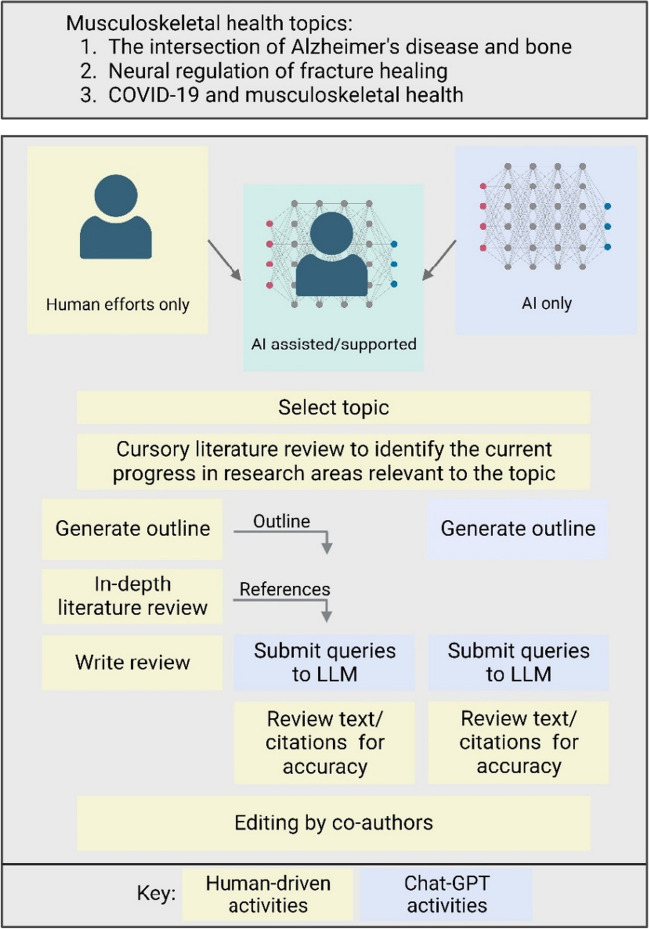 Purpose of review: With the recent explosion in the use of artificial intelligence (AI) and specifically ChatGPT, we sought to determine whether ChatGPT could be used to assist in writing credible, peer-reviewed, scientific review articles. We also sought to assess, in a scientific study, the advantages and limitations of using ChatGPT for this purpose. To accomplish this, 3 topics of importance in musculoskeletal research were selected: (1) the intersection of Alzheimer's disease and bone; (2) the neural regulation of fracture healing; and (3) COVID-19 and musculoskeletal health. For each of these topics, 3 approaches to write manuscript drafts were undertaken: (1) human only; (2) ChatGPT only (AI-only); and (3) combination approach of #1 and #2 (AI-assisted). Articles were extensively fact checked and edited to ensure scientific quality, resulting in final manuscripts that were significantly different from the original drafts. Numerous parameters were measured throughout the process to quantitate advantages and disadvantages of approaches.