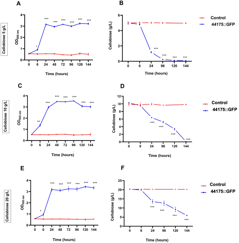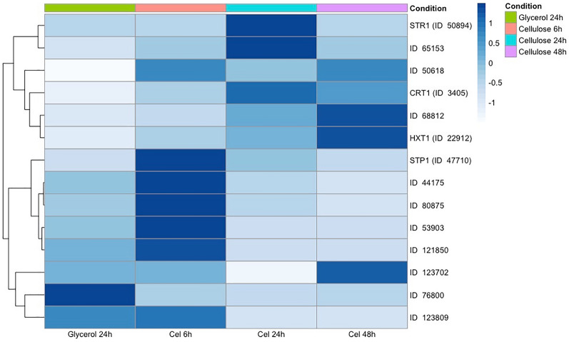Results: To address this gap, this study used temporal membrane proteomics analysis to identify five known and nine putative sugar transporters that may be involved in cellulose degradation by T. reesei. Docking analysis pointed out potential ligands for the putative sugar transporter Tr44175. Further functional validation of this transporter was carried out in Saccharomyces cerevisiae. The results showed that Tr44175 transports a variety of sugar molecules, including cellobiose, cellotriose, cellotetraose, and sophorose.
