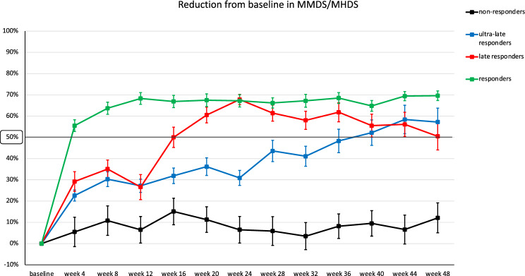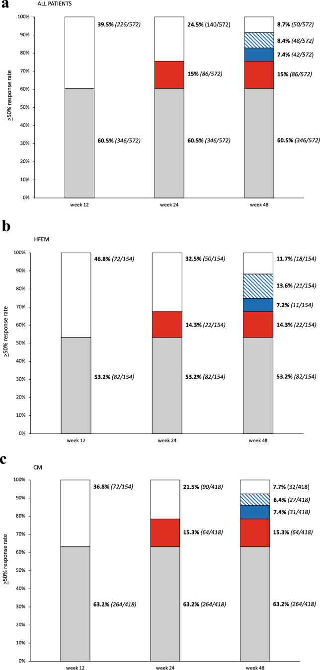 Methods: In this multicenter (n = 16), prospective, observational, real-life study, we enrolled all consecutive adults affected by high-frequency episodic migraine (HFEM: ≥ 8 days/month) or chronic migraine (CM), with ≥ 3 prior therapeutic failures, treated with any anti-CGRP mAbs for ≥ 48 weeks. We defined responders patients with a ≥ 50% response rate ≤ 12 weeks, late responders those with a ≥ 50% response rate ≤ 24 weeks, and ultra-late responders those achieving a ≥ 50% response only > 24 weeks.