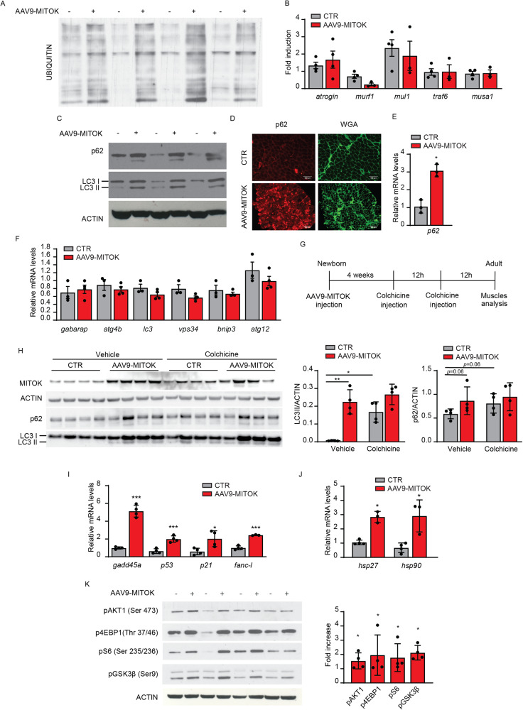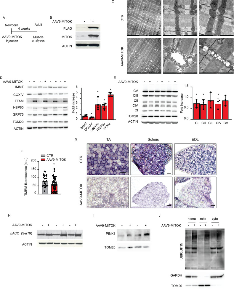 MitoKATP is a channel of the inner mitochondrial membrane that controls mitochondrial K+ influx according to ATP availability. Recently, the genes encoding the pore-forming (MITOK) and the regulatory ATP-sensitive (MITOSUR) subunits of mitoKATP were identified, allowing the genetic manipulation of the channel. Here, we analyzed the role of mitoKATP in determining skeletal muscle structure and activity. Mitok-/- muscles were characterized by mitochondrial cristae remodeling and defective oxidative metabolism, with consequent impairment of exercise performance and altered response to damaging muscle contractions. On the other hand, constitutive mitochondrial K+ influx by MITOK overexpression in the skeletal muscle triggered overt mitochondrial dysfunction and energy default, increased protein polyubiquitination, aberrant autophagy flux, and induction of a stress response program. MITOK overexpressing muscles were therefore severely atrophic. Thus, the proper modulation of mitoKATP activity is required for the maintenance of skeletal muscle homeostasis and function.