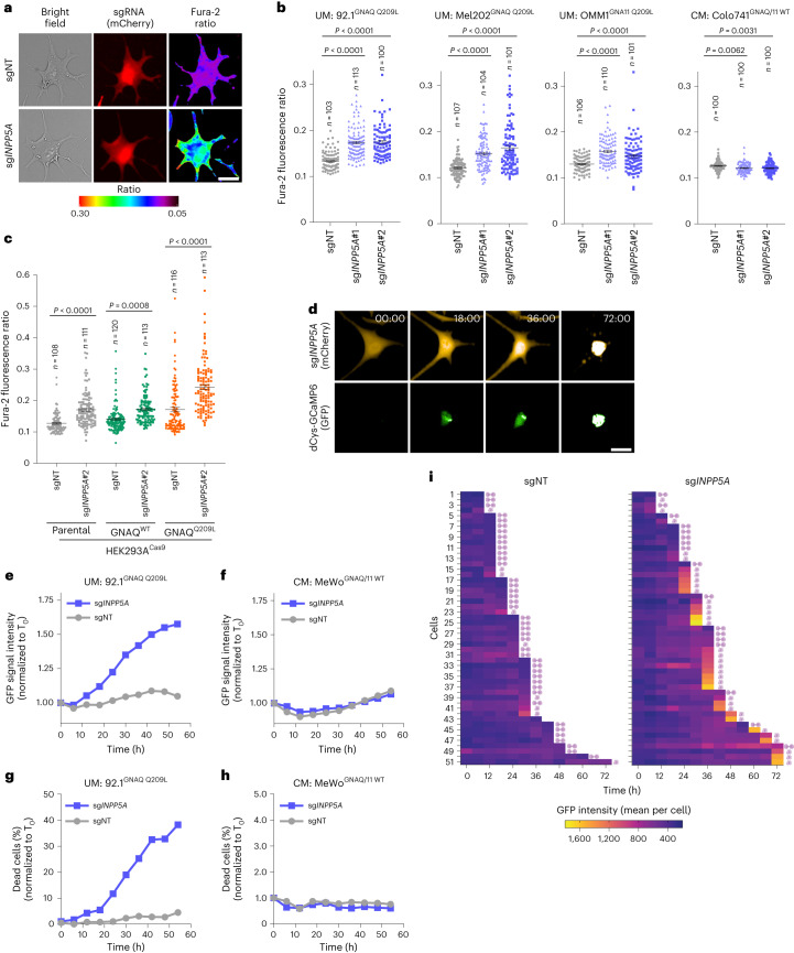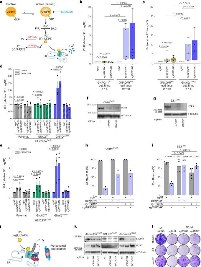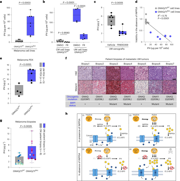 Activating mutations in GNAQ/GNA11 occur in over 90% of uveal melanomas (UMs), the most lethal melanoma subtype; however, targeting these oncogenes has proven challenging and inhibiting their downstream effectors show limited clinical efficacy. Here, we performed genome-scale CRISPR screens along with computational analyses of cancer dependency and gene expression datasets to identify the inositol-metabolizing phosphatase INPP5A as a selective dependency in GNAQ/11-mutant UM cells in vitro and in vivo. Mutant cells intrinsically produce high levels of the second messenger inositol 1,4,5 trisphosphate (IP3) that accumulate upon suppression of INPP5A, resulting in hyperactivation of IP3-receptor signaling, increased cytosolic calcium and p53-dependent apoptosis. Finally, we show that GNAQ/11-mutant UM cells and patients' tumors exhibit elevated levels of IP4, a biomarker of enhanced IP3 production; these high levels are abolished by GNAQ/11 inhibition and correlate with sensitivity to INPP5A depletion. Our findings uncover INPP5A as a synthetic lethal vulnerability and a potential therapeutic target for GNAQ/11-mutant-driven cancers.