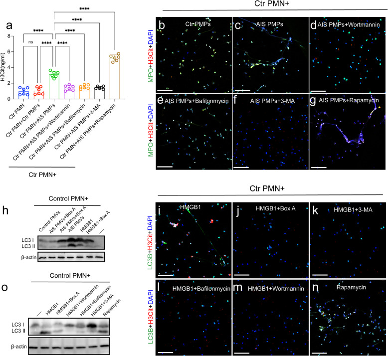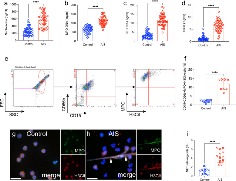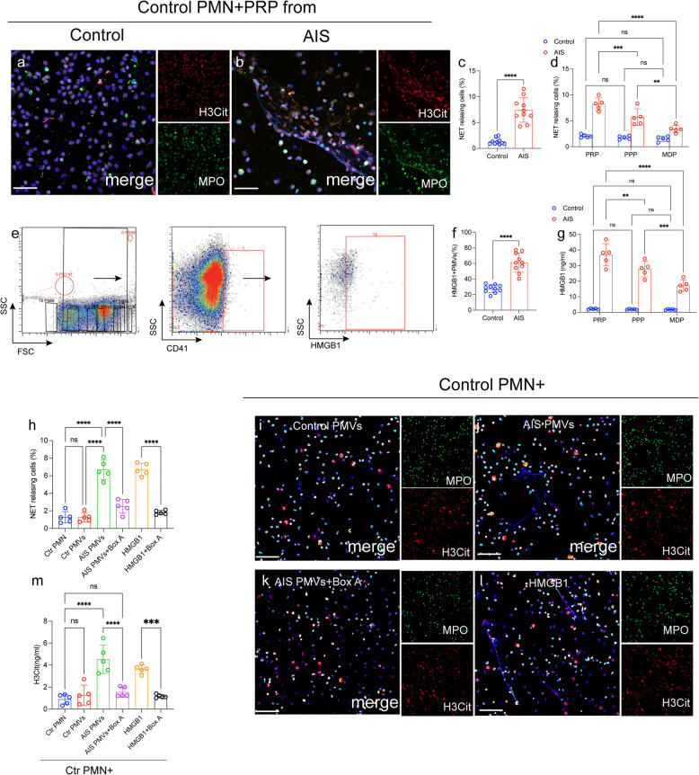 Methods: As well as 45 healthy subjects, 45 patients with AIS had ELISA tests performed to detect NET markers. Expression of high-mobility group box 1 (HMGB1) on platelet microvesicles (PMVs) was analyzed by flow cytometry in healthy subjects and AIS patients' blood samples. We established middle cerebral artery occlusion (MCAO) mice model to elucidate the interaction between PMPs and NETs.