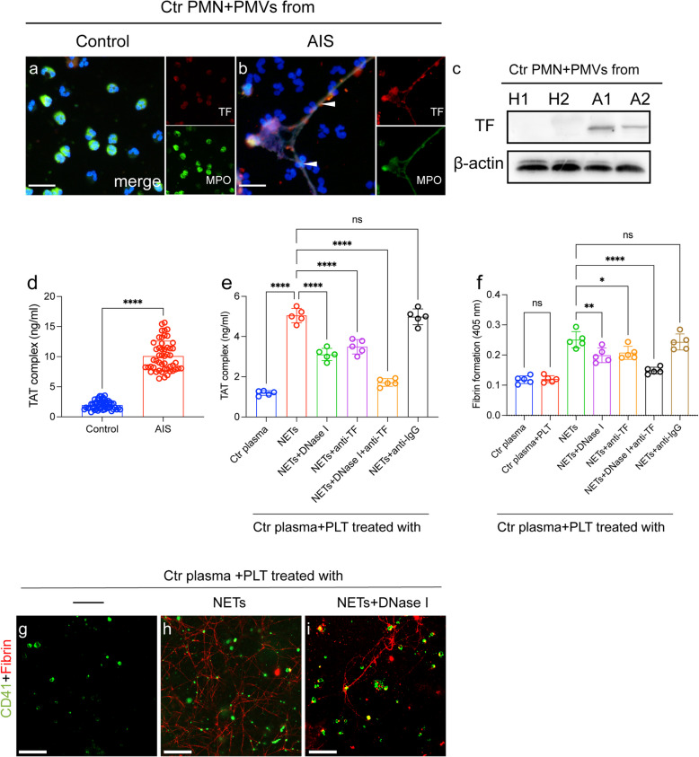 Results: A significant elevation in NET markers was found in patient plasma in AIS patients, and neutrophils generated more NETs from patients' neutrophils. HMGB1 expression was upregulated on PMVs from AIS patients and induced NET formation. NETs enhanced Procoagulant activity (PCA) through tissue factor and via platelet activation. Targeting lactadherin in genetical and in pharmacology could regulate the formation of NETs in MCAO model.