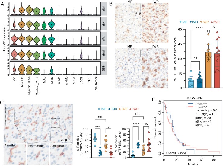 Background: Glioblastomas (GBMs) are central nervous system tumors that resist standard-of-care interventions and even immune checkpoint blockade. Myeloid cells in the tumor microenvironment can contribute to GBM progression; therefore, emerging immunotherapeutic approaches include reprogramming these cells to achieve desirable antitumor activity. Triggering receptor expressed on myeloid cells 2 (TREM2) is a myeloid signaling regulator that has been implicated in a variety of cancers and neurological diseases with contrasting functions, but its role in GBM immunopathology and progression is still under investigation.