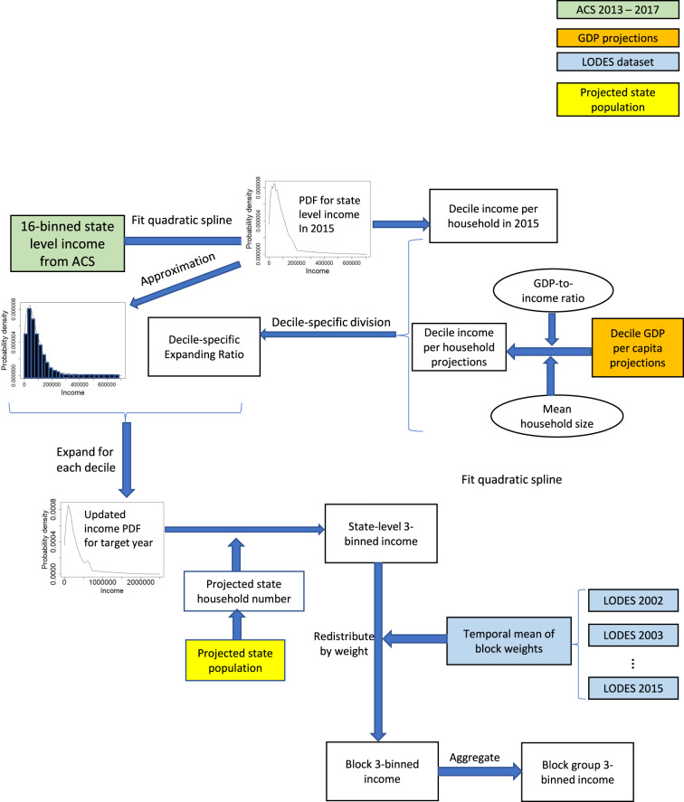 High-resolution income projections under different Shared Socioeconomic Pathways (SSPs) are essential for the climate change research communities to devise climate change adaptation and mitigation strategies. To generate income projections for Washington state, we obtain state-level GDP per capita projections and convert them into projected annual household income. The resulting state-level income projections are subsequently downscaled to the census block-level based on the Longitudinal Origin-Destination Employment Statistics (LODES) dataset. For accuracy assessment, we downscale historical income data from state- level to block- and block group-level and compare the downscaled results against the actual income data from LODES. County-level accuracy assessment is also conducted based on American Community Survey. The results demonstrate a good agreement (Average R2 of 0.67, 0.8, and 0.99 for block-, block group-, and county-level, respectively) between the downscaled income data and the reference data, thereby validating the methodology employed. Our approach is applicable to other states for income projections, which can be utilized by a broader audience, including those involved in demographic analysis, economic research, and urban planning.